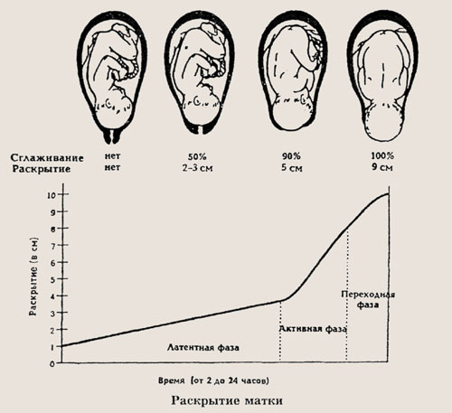 В соответствии с происходящими физиологическими изменениями процесс родов подразделяют на три периода. Первый период самый продолжительный, его называют периодом раскрытия шейки матки. С началом родов схватки усиливаются и шейка матки раскрывается; этот период родов в норме длится от 2 до 24 часов. Средняя продолжительность первого периода у первородящих составляет 12 '/..часов; у повторнородящих — 7 V3 часа. Схватки продолжаются с перерывами в течение всех родов, укорачивая мышечные волокна тела матки и растягивая шейку матки. Каждое сокращение проходит волной: оно достигает пика, затем постепенно ослабевает, позволяя матке некоторое время отдохнуть. В начале родов схватки могут ощущаться как тупая боль в пояснице или как менструальные боли. Эти начальные схватки обычно (но не всегда) короткие и несильные, продолжающиеся от 30 до 40 секунд с интервалом до 15-20 минут. Некоторые роды, однако, начинаются с частых и достаточно сильных схваток. С развитием процесса родов вы почувствуете схватки больше в животе или и в животе, и в пояснице, а боль в пояснице может не проходить и между схватками. К концу первого периода схватки обычно очень интенсивны и длятся по 90-120 секунд с интервалом всего в две-три минуты. Обычно сильные схватки более эффективны и для раскрытия шейки матки, и для выталкивания ребенка. Схватки происходят непроизвольно, под контролем гормональных и других физиологических факторов. Начавшись, процесс обычно не останавливается до рождения ребенка. К моменту полного раскрытия матки обычно вскрывается околоплодный пузырь и изливаются околоплодные воды. Основными показателями, по которым судят о правильности течения первого периода родов, являются частота, регулярность и сила схваток, а также скорость раскрытия шейки матки. Состояние шейки матки в родах определяет врач, производя влагалищное исследование, а качество схваток оценивается с помощью специальных приборов — мониторов, которые, кроме показателей родовой деятельности, регистрируют и частоту сердечных сокращений плода. Если монитора нет, схватки просто подсчитывают, определяя их продолжительность и интервалы между ними по секундомеру, а их силу — по тому, как напрягается матка во время схватки. Для этого кладут ладонь на живот беременной. Второй период родов, или период изгнания плода, следует непосредственно за первым. К его началу схватки достигают значительной продолжительности и силы, а так как шейка матки более не препятствует рождению плода, матка понемногу выжимает его из своей полости. Хотя схватки в конце первого периода родов значительно сильнее и продолжительнее, чем в начале, их силы недостаточно для того, чтобы преодолеть сопротивление тканей родового канала продвигающейся головке плода. Когда головка опускается в полость малого таза, включается рефлекторный механизм, заставляющий сокращаться мышцы передней брюшной стенки (как при акте дефекации), а также мышцы промежности, живота, бедер и ряд других мышц, синхронные с сокращениями матки, называются они потугами. При потугах резко увеличивается давление в брюшной полости и полости матки, благодаря чему плод и продвигается по родовому каналу.