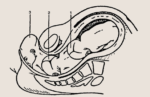 Движение плода в родовых путях: 1 - сгибание головки при входе в малый таз, 2 - внутренний поворот головки в полости малого таза, 3 - разгибание и рождение головки С особенностями размеров малого таза и формою головки плода связаны те движения, которые совершит плод в процессе рождения. Головка плода вначале сгибается так, чтобы проходить через плоскости малого таза наименьшими размерами, затем, по мере продвижения, повторяя форму родового канала, головка совершает внутренний поворот, потом показывается из половой щели, разгибается и рождается. После рождения головки внутренний поворот совершает плечевой пояс плода. Плечики опускаются по родовому каналу и рождаются. Вслед за ними без затруднений рождается туловище и ножки, поскольку размер их существенно меньше уже родившихся головки и плечевого пояса плода. Бывают случаи, когда размеры плода (прежде всего его головки) больше размеров малого таза, через которые она должна пройти. Это встречается при рождении крупного ребенка и даже ребенка нормальных размеров, если у его матери узкий таз. Естественные роды при этом становятся невозможными, и родоразрешение производится путем операции кесарева сечения (см. ниже). Во втором периоде родов, как и в первом, родовая деятельность может ослабеть — наблюдается слабость потуг. При этом плод как бы «застревает» в полости малого таза, что обычно приводит к его гипоксии. При ее возникновении сразу изменяется частота сердцебиения плода. Нужно сказать, что по характеру сердечной деятельности судят о состоянии плода во время родов. Его сердцебиение прослушивают и в период беременности, и при родах с помощью специального портативного прибора (если не производится непрерывный мониторный контроль) или акушерского стетоскопа не реже 2 раз в час в первом периоде родов и после каждой потуги — во втором. После рождения головки плода из его носовых ходов и полости рта удаляют слизь, чтобы она не попала в дыхательные пути, когда ребенок начнет самостоятельно дышать. Родившегося малыша отделяют от плаценты, которая еще находится в полости матки. Для этого пуповину пересекают между двумя зажимами. С момента первого вдоха (крика) плод становится новорожденным. Рождением ребенка завершается второй период родов. Третий период называют еще последовым. Объем матки после рождения ребенка значительно уменьшается. Требуется некоторое время для того, чтобы она вновь обрела тонус — отделение и рождение последа также происходит благодаря ее сокращениям. Обычно они начинаются через 5-10 минут после окончания второго периода у первородящих и несколько позже — у повторнородящих, так как мышца матки у них обладает меньшим тонусом из-за растяжения в предыдущих родах. Обычно послед рождается за 15-20 минут. Если плацента под действием сокращений матки не отделяется от ее стенки и не рождается в течение 20-30 минут, ее приходится либо отделять и удалять под наркозом, либо выжимать. При выжимании у женщин возникают кратковременные неприятные ощущения, и роды заканчиваются. Продолжительность родов при правильном их течении составляет у первородящих 15-20, а у повторнородящих — 10-12 часов. Женщина, которая в родах была роженицей, теперь становится родильницей. По окончании родов женщина еще 2 часа остается в родильном зале. Врач обязательно осматривает плаценту и родовы