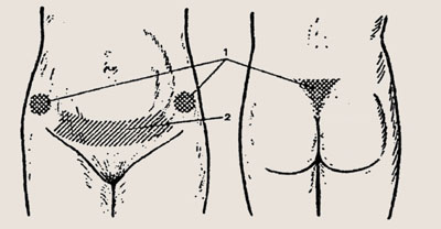 Зоны рефлекторного воздействия во время схваток: 1 - надавливание, 2 - поглаживание Кроме того, вам нужно следить за временем начала и окончания схваток. Напоминать себе с появлением каждой из них, что вот еще немного раскрылась шейка матки, вы стали чуть-чуть ближе к окончанию родов, что вам нужно ровно и спокойно дышать, чтобы помочь своему малышу. Если вам очень больно, скажите об этом врачу. И он, в зависимости от ситуации, найдет способ вам помочь. В первом периоде родов у многих женщин возникает рвота. Если при этом нет других патологических симптомов — например, болей в желудке, головной боли, «мелькания мушек» перед глазами, — это не страшно и обычно бывает связано с изменением тонуса вегетативной нервной системы во время родов, а также с раскрытием шейки матки. Такая рвота обычно длится недолго и не требует специального вмешательства. После прекращения позывов на рвоту нужно прополоскать рот водой и сделать 1-2 глотка, но не более, чтобы не спровоцировать новый приступ тошноты. Во втором периоде родов вас переведут в родовой зал. Потугами вы можете управлять. Эффективность потуг контролируют врач и акушерка. В этом периоде роженица испытывает несколько неприятное чувство распирания. Нужно сказать, что болезненность потуг во многом зависит от того, правильно ли вы тужитесь и правильна ли ваша поза. Вы лежите на родовом столе, плечи у вас немного приподняты. Упритесь стопами в стол, ухватитесь руками за поручни родильного стола и, глубоко вздохнув, задержите дыхание, плотно закрыв рот, натужьтесь. Так вы усилите потуги. Затем расслабьтесь и глубоко, спокойно дышите без задержек на вдохе. Потуги становятся наиболее сильными, когда головка проходит через таз. Как только она появляется из наружных половых органов, акушерка оказывает пособие, защищающее мышцы промежности от разрыва. В это время необходимо очень точно выполнять все указания акушерки. Помните о том, что головка плода выводится из половых путей вне потуги. Для этого, несмотря на возникающий рефлекс потуги, нужно сдерживать ее — расслабиться и дышать через рот без малейшей задержки на вдохе. Роды дома В последние годы в развитых странах, да и в нашей стране, растет интерес к родам дома. Это связано со стремлением будущих родителей: 1) исключить вмешательство в естественное течение родов, 2) создать роженице условия максимального психологического комфорта — «дома и стены помогают», 3) не иметь контакта с посторонними людьми — возможными носителями инфекции. Кроме того, жены желают рожать в присутствии мужа, а муж хочет присутствовать при родах. Как считают большинство специалистов, эти обстоятельства положительно сказываются на течении родов и на дальнейших взаимоотношениях в семье. К сожалению, у нас в стране традиция родов дома утрачена. Система отечественного родовспоможения совершенно не предусматривает и практически исключает такую возможность. Женщину, родившую дома, полагается госпитализировать вместе с новорожденным, причем, в обсервационное отделение. Если, тем не менее, вы непременно хотите рожать дома, сначала все как следует обдумайте и приготовьтесь. Вам обязательно потребуется консультация специалиста-акушера. Мы же, со своей стороны, дадим несколько советов. Вы можете рожать дома, если: 1) у вас уже есть ребенок и первые роды прошли без отклонений