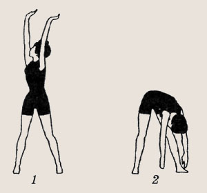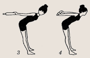 Наклонитесь вперед и вправо, стараясь достать кончиками пальцев пол, выпрямитесь. Сделайте то же с наклоном влево. И в этом упражнении бедра и ноги должны оставаться неподвижными (2). Грудь и плечи. Держа в правой руке скалку, наклонитесь вперед, одновременно отводя правую руку со скалкой назад; повторите упражнение, переложив скалку в левую руку (3).