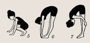 Возьмите скалку в обе руки за спину; наклоняясь вперед, старайтесь как можно выше поднять руки (4). Бедра и икры. Опуститесь на корточки, положив ладони на пол, выпрямитесь, встаньте на полные ступни (5). Не сгибая ног, наклонитесь вперед, стараясь коснуться руками пальцев ног, выпрямитесь (6).