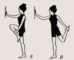 Бедра и спина. Наклонившись вперед, возьмитесь руками за икры ног и постарайтесь подтянуть голову к коленям (7). Грудь и руки. Возьмите в каждую руку по бутылке из-под лимонада или молока и широкими плавными движениями вращайте их попеременно то вперед, то назад. Бедра и ягодицы. Упритесь правой рукой в стену или дверь, подтяните левой рукой левую ногу коленом к животу, спину держите прямо (8). Взявшись левой рукой за носок левой ноги, подтяните ступню к ягодицам (9). Повторите упражнение, переменив руку и ногу.