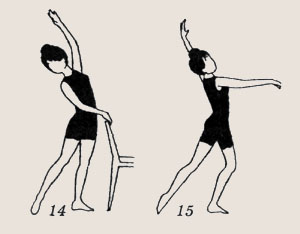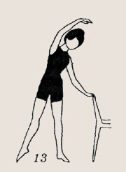 Руки и талия. Ноги вместе, правая рука опущена, левая лежит на спинке стула. Правую ногу отставьте в сторону на носок, одновременно поднимите в сторону и вверх правую руку, наклонитесь влево (13). Повторите упражнение, повернувшись к стулу правым боком. Живот и спина. Встаньте лицом к спинке стула, обопритесь на него правой рукой. Отставьте в сторону и назад на носок правую ногу, поднимите вверх левую руку, прогнитесь назад (14). Повторите упражнение, опершись на спинку стула левой рукой и отставляя в сторону и назад левую ногу и поднимая правую руку.