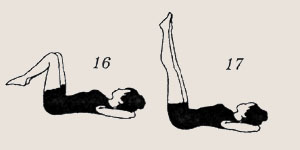 Это же упражнение можно выполнять без помощи стула под музыку, попеременно отставляя в сторону и назад то правую, то левую ногу и соответственно поднимая попеременно вверх то левую, то правую руку (15). Следите за плавностью движений. Упражнения лежа Живот, колени и икры. Лягте на коврик на спину, руки заложите за голову, ноги вытяните. Медленно согните ноги в коленях, подтяните их к животу (16). Выпрямите ноги, подержите их несколько секунд под прямым углом к туловищу, плавно опустите (17). Колени и икры. Перевернитесь на живот, положите лицо на руки, ноги вытянутые. Медленно согните их в коленях так, чтобы коснуться ступнями ягодиц, так же медленно выпрямите. Это же упражнение можно выполнять под музыку попеременно то правой, то левой ногой, а то и обеими ногами сразу.