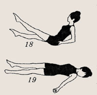 Талия и живот. Сядьте на пол, обопритесь на локти, ноги вытянуты. Под музыку попеременно поднимайте то правую, то левую ногу (18). Это упражнение, известное под названием «ножницы», можно усложнить, делая круговые движения ногами. Не старайтесь поднять ноги слишком высоко; упражнение эффективнее тогда, когда делается как можно ближе от пола. Почувствовав, что талия и мышцы живота укрепились, можете ускорить темп упражнения. Следует заметить, что как это, так и другие упражнения вы можете по собственному усмотрению разнообразить. Так, «ножницы» могут быть не только вертикальные, но и горизонтальные (ноги движутся крест-накрест), круговые движения ногами могут проходить по часовой стрелке, а могут против и т. д. Если вы устанете, расслабьтесь и минуту-другую отдохните (19).