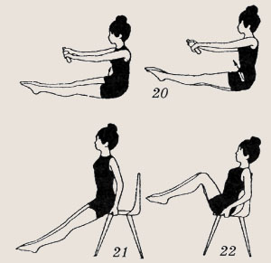 Живот. Пересядьте с пола на краешек стула, возьмитесь руками за низ сиденья. Спина и ноги прямые, ступни касаются пола (21). Медленно, ощущая напряжение мышц живота, подтяните согнутые в коленях ноги к груди, спину держите все время прямо (22). Не опуская ног на пол, так же медленно выпрямите их, стараясь удержать на весу как можно выше (23).
