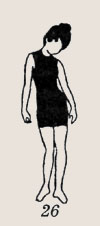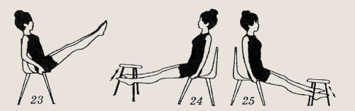 Живот, талия и ноги. Сидя на стуле, сожмите стопами ног ножки табурета, приподнимите его над полом и удерживайте на весу в течение 10 секунд (24). Плавно опустите табурет. Повторите упражнение, просунув ноги между ножками табурета, и, отжав стопы, приподнимите табурет над полом и также постарайтесь удержать его на весу в течение 10 секунд (25). Следите за тем, чтобы мышцы живота и талии были в напряжении, спину держите прямо. Следующие упражнения помогут вам выработать правильную осанку. Их можно выполнять как сидя, так и стоя. Сядьте на кончик стула так, чтобы спина, бедра и голени находились под прямым углом друг к другу, руки свободно опустите, плечи слегка согните. Напрягите одновременно икры ног, мышцы живота и спины, плечи отогните как можно дальше назад, чтобы лопатки коснулись одна другой, голову запрокиньте. Посидите несколько секунд в таком напряженном положении, затем снова расслабьтесь. А теперь встаньте со стула, соедините пятки, напрягите колени, ягодицы и мышцы живота. Приподнимитесь на носках так высоко, как только это вам удастся, напрягите все тело, затем медленно расслабьтесь (26). Упражнение несложное, но его следует повторять на протяжении длительного времени, пока вы не убедитесь, что в расслабленном состоянии ваша осанка приобрела изящество.