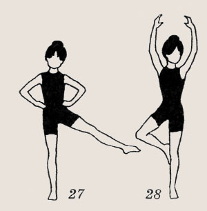 Для каждой женщины важна не только изящная осанка, но и красивая походка. Красивую походку, если вы не хотите, чтобы она выглядела искусственной, также можно выработать с помощью несложных упражнений. Положите руку на пояс, распрямите плечи, медленно отведите в сторону левую ногу и постойте в такой позе, не напрягаясь, секунд 10-15 (27). Повторяйте упражнение до тех пор, пока не почувствуете, что легко удерживаете равновесие. Это упражнение можно усложнить, приставляя ступню отставленной ноги к колену опорной ноги и плавно поднимая руки в стороны и вверх (28). Если и это упражнение покажется вам легким, можете приподняться на носок опорной ноги и в таком положении постоять секунд 10-15. Овла дев этим упражнением в разных вариантах, начните выполнять его под музыку, что придаст вашим упражнениям ритм и повысит настроение.