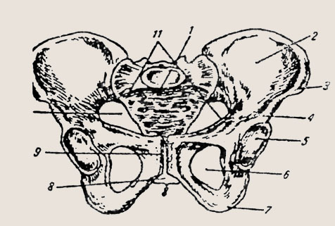 Женский таз: 1 — крестец; 2 — крыло подвздошной кости; 3 — передневерхняя ость; 4 — передненижняя ость; 5 - ветлужная впадина; 6 — запи-рательное отверстие; 7 — седалищный бугор; 8 — лобковая дута; 9 — симфиз; 10 — вход в малый таз; 11 — безымянная линия Верхние и нижние ветви лобковых костей спереди соединяются друг с другом посредством хряща, образуя малоподвижное соединение, что позволяет несколько растянуться ему при беременности, увеличивая таким образом объем таза. Крестец и копчик, состоящие из отдельных позвонков, образуют заднюю стенку таза. Различают большой и малый таз. Наибольшее значение при беременности имеет малый таз, так как он представляет собой часть родового канала. Его форма и размеры имеют очень большое значение в течение родов. В малом тазу различают вход, полость и выход. В полости малого таза выделяют широкую и узкую части. В соответствии с этим различают четыре плоскости: плоскость входа в малый таз, плоскость широкой части малого таза, плоскость узкой части малого таза и плоскость выхода из малого таза. Если соединить середины всех прямых размеров малого таза, то получится линия, изогнутая в виде крючка, которая называется проводной осью таза. Движение плода по родовому каналу происходит по направлению проводной оси таза. Исследование таза Проводится у беременной при первом посещении женской консультации путем осмотра, ощупывания и измерения. Особое значение придается осмотру пояснично-кре-стцового ромба, представляющего собой площадку на задней поверхности крестца. Верхним углом ромба является углубление между остистым отростком V поясничного позвонка и началом среднего крестцового гребня. Нижний угол соответствует верхушке крестца, боковые углы — задне-верхним остям подвздошных костей.
