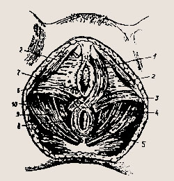 Мышцы тазового дна: 1 -- луковично-пещеристая мышца; 2 — седалищно-пещерис-тая мышца; 3 — поверхностная поперечная мышца промежности; 4 — сухожильный центр промежности; 5 — сфинктер прямой кишки; 6 — мочеполовая диафрагма; 7 — бартолинова железа; 8-10 — диафрагма таза Тазовое дно, образованное тремя слоями мышц и фасциями является опорой для внутренних половых органов и других органов брюшной полости. Несостоятельность мышц тазового дна может привести к выпадению половых органов, мочевого пузыря, прямой кишки. Половые органы женщины Половые органы делятся на наружные и внутренние. К наружным половым органам относятся: лобок, большие и малые половые губы, клитор, девственная плева, преддверие влагалища, лобок, железы преддверия влагалища. Наружные половые органы принято считать органами полового чувства.