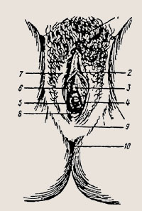 Наружные половые органы женщины: 1 — лобок; 2 — клитор; 3 — наружное отверстие мочеиспускательного канала; 4 — девственная плева; 5 — вход во влагалище; 6 -- малая половая губа; 7 — большая половая губа; 8 — задняя спайка губ; 9 — промежность; 10 — задне-проходное отверстие. Лобок (mons pubis) — представляет собой богатое подкожным жиром возвышение, располагающееся спереди и выше лобкового сочленения. Верхней границей лобка является поперечная кожная бороздка — надлобковая складка, справа и слева от лобка — паховые складки, кзади лобок сливается с большими половыми губами. Лобок покрыт волосами. Рост волос на лобке связан с деятельностью яичников и коры надпочечников. Большие половые губы (labia majora pudendi) — две продольные складки кожи, ограничивающие с боков половую щель. Спереди они переходят в кожу лобка, кзади посте- пенно сужаются и, соединяясь по средней линии, образуют заднюю спайку. Кожа на внешней поверхности покрыта волосами, содержит потовые и сальные железы. Внутренняя поверхность покрыта нежной розовой кожицей. Пространство между большими половыми губами называется половой щелью. В толще половых губ заложены железы преддверия — бартолиновы, вырабатывающие секрет. Железы располагаются в толще задних отделов больших губ, их выводные протоки открываются в борозде, образованной малыми половыми губами и плевой. Пространство между задней спайкой и заднепроходным отверстием называется промежностью. Она представляет собой мышечно-фасциальную пластинку, покрытую снаружи кожей; на коже промежности заметна линия, идущая от задней спайки до заднего прохода — шов промежности. Высота промежности снаружи 3—4 см. По направлению вглубь промежность сужается, так как влагалище и прямая кишка приближаются друг к другу. Малые половые губы (labia minora pudendi) — вторая пара продольных кожных складок. Они располагаются кнут-ри от больших половых губ вдоль основания последних. Спереди малые половые губы раздваиваются и образуют 2 пары ножек. Передняя пара, соединяясь по средней линии над клитором, образует складочку — крайнюю плоть клитора. Вторая пара ножек, соединяясь под клитором, образует уздечку клитора. Кзади губы становятся ниже и сливаются с большими на уровне средней трети последних, богато снабжены сосудами и нервными окончаниями. Клитор (clitoris) — небольшое конусовидное образование, состоящее из 2 пещеристых тел. Клитор выдается в виде небольшого бугорка в переднем углу половой щели. Различают головку, тело, состоящее из пещеристых тел и ножек. Клитор обильно снабжен сосудами и нервами, в коже клитора много нервных окончаний. Клитор является органом полового чувства. Преддверие влагалища (vestidulum vaginal) — пространство, ограниченное спереди клитором, сзади задней спайкой половых губ, с боков внутренней поверхностью малых половых губ. Преддверия является плева (ее остатки). В преддверии открывается наружное отверстие мочеиспускательного канала, выводные протоки больших желез. Девственная плева (humer) — соединительно-тканная перепонка, закрывает вход во влагалище у девственниц. Снаружи и со стороны влагалища покрыта плоским эпителием, в соединительно-тканной основе есть мышечные волокна, сосуды и нервы. Имеет отверстия разной формы. В соответствии с этим плева бывает кольцевидной, полулунной, зубчатой, трубчатой формы. После первого поло