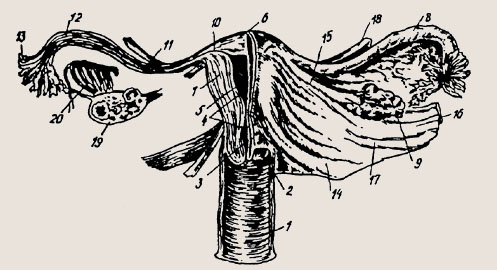 Внутренние половые органы женщины (фронтальный разрез): 1 — влагалище; 2 — влагалищная часть шейки матки; 3 — шеечный канал; 4 — перешеек; 5 — полость матки; 6 — дно матки; 7 — стенка матки; 8 — маточная труба; 9 — яичник; 10 — интерсти-циальная часть трубы; 11 — истмическая часть трубы; 12 — ампу-лярная часть трубы; 13 — фимбрии трубы; 14 — крестцово-маточ-ная связка; 15 — собственная связка яичника; 16 — воронкотазовая связка; 17 — широкая связка; 18 — круглая связка; 19 — яичник (на разрезе) с фолликулами и желтым телом; 20 — паровариум Дно матки — верхняя часть, выступающая выше уровня вхождения в матку маточных труб. Тело матки имеет треугольное очертание, суживаясь постепенно по направлению к шейке. Шейка является продолжением тела. В ней различают влагалищную часть и верхний отрезок, примыкающий к телу. Внутри шейки матки проходит церви-кальный канал, открывающийся во влагалище наружным, а в полость матки - внутренним зевом. В области углов основания матки в ее полость открываются маточные трубы. На границе между телом матки и шейкой располагается перешеек матки, из которого во время беременности формируется нижний сегмент. Стенка матки состоит из трех основных слоев. Наружный слой представлен брюшиной, являющейся ее серозной оболочкой. Средний слой — мышцы, составляющие главную часть стенки. Мышцы переплетаются в различных направлениях (продольном, поперечном и косом). Они во время беременности гипертрофируются, и за счет этого вес матки достигает одного килограмма. Особенно мощная мышечная прослойка в теле матки, внутренний слой матки представляет слизистую оболочку, так называемый эндометрий (функциональный и базальный слои). Маточные трубы отходят от боковых поверхностей дна матки с обеих сторон (tuba uterina, tuba Fallopii). Это парный трубчатый орган длиной 10-12 см. Трубы заключены в складку брюшины, составляющую верхнюю часть широкой маточной связки и носящую название «брыжейка трубы». Маточная труба имеет следующие отделы: маточная часть (в толще матки), перешеек (в складке брюшины) и ампула маточной трубы (расширенная часть трубы, обращенная в брюшную полость). Концы трубы называются воронкой трубы. Края воронки снабжены многочисленными отростками различной длины и формы (бахромки). Одна из бахромок тянется в складке брюшины до яичника. Просвет трубы уменьшается по мере приближения к матке (1 см), а у воронки он расширен до 6-8 см. Снаружи труба покрыта соединительно-тканной оболочкой, под нею - мышечная (продольный и поперечный слои) оболочка. Следующий, внутренний, слой представлен слизистой оболочкой, выстланной мерцательным эпителием, имеющим складки. Яичники (ovarium) — парный орган, являющийся женской половой железой. Это овальное тело длиной 2,5 см, шириной 1,5 см, толщиной 1 см. В нем различают две поверхности и два полюса. Верхний край яичника, закругленный, обращен к маточной трубе. Один полюс яичника соединен с маткой собственной связкой. Второй полюс обращен к боковой стенке таза. Свободный край яичника смотрит в брюшную полость. Другим краем яичник прикреплен к заднему листку широкой связки. В яичнике имеется корковый и мозговой слои. В корковом слое созревают фолликулы, в мозговом проходят сосуды и нервы. Сверху яичник окутан эпителиальным покровом, под которым расположена белочная оболочка. Кровоснабжение матки происходит за счет м