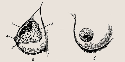 Молочная железа: а — схема строения молочной железы: 1 — дольки молочной железы; 2 — жировая ткаш.; 3 — молочные протоки; 4 — сосок; б — околососковый кружок (ареола) и сосок Они пронизывают всю ткань железы и образуют ее мягкий остов, в котором располагается жировая клетчатка, молочные протоки, кровеносные и лимфатические сосуды, нервы. Молочная железа снабжается кровью ветвями внутренней, грудной и подмышечной артерий, а также ветвями межреберных артерий. Менструальный цикл и его регуляция Менструальный цикл — одно из проявлений сложного биологического процесса в организме женщины, характеризующегося циклическими изменениями функции половой системы, а также других систем организма (сердечнососудистой, нервной, эндокринной и др.). Нормальный менструальный цикл включает 3 компонента: 1) циклические изменения в системе гипоталамус — гипофиз — яичники; 2) циклические изменения в гормонально зависимых органах (матке, маточных трубах, влагалище, молочных железах); 3) циклические изменения (колебания функционального состояния) в нервной, эндокринной и других системах организма. Изменения в организме женщины на протяжении менструального цикла носят двухфазный характер, что связано с ростом и созреванием фолликула, овуляцией и развитием желтого тела в яичниках. Наиболее выраженные изменения происходят в слизистой оболочке матки (эндометрии). Если оплодотворение яйцеклетки не происходит, функциональный слой эндометрия отторгается и появляются кровянистые выделения из половых путей (менструация), что свидетельствует об окончании циклических изменений в организме. Длительность менструального цикла определяют от первого дня наступившей менструации до первого дня следующей менструации. В норме продолжительность менструального цикла от 21 до 35 дней. Наиболее оптимальным считается 28-дневный цикл. В яичниках под влиянием гонадотропных гормонов гипофиза наблюдают 2 фазы: 1) фаза развития фолликула и разрыва созревшего фолликула — фолликулиновая фаза; 2) фаза развития желтого тела - лютеиновая фаза. Процесс созревания фолликула занимает первую половину менструального цикла. Яйцеклетка, заключенная в фолликуле, увеличивается за счет деления. В яичнике в это время вырабатываются эстрогенные гормоны (эстради-ол, эстрон, эстриол). Под их воздействием происходит рост и развитие матки, влагалища, наружных половых органов, а также появление вторичных половых признаков, повышается тонус мускулатуры матки, усиливается ее возбудимость, развиваются молочные железы и их функция, происходит пролиферация в слизистой матки. В фазе овуляции происходит разрыв зрелого фолликула и выход из его полости созревшей, годной к оплодотворению яйцеклетки. Яйцеклетка, окруженная лучистым венцом, вместе с фолликулярной жидкостью попадает в брюшную полость, а в дальнейшем — в маточную трубу. Это происходит в середине любого менструального цикла. Фаза развития желтого тела (лютеиновая). На месте разорвавшегося фолликула образуется новая железа внутренней секреции — желтое тело, продуцирующее гормон прогестерон, который подготавливает организм к беременности и потому называется еще гормоном беременности или гормоном желтого тела. Кроме этого, он снижает возбудимость и сократительную деятельность матки, способствует подготовке молочных желез к с