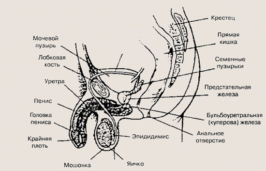 В периоде пременопаузы к возрасту 45 лет в яичниках женщины остается менее 10000 ооцитов, происходят выраженные дистрофические изменения в фолликулах, резко снижается продукция эстрогенов, возрастает продукция ФСГ и ЛГ в несколько раз. При физиологическом течении этого периода происходит постепенное снижение функции яичников с адекватной реакций организма на возрастные изменения. При патологическом течении развивается климактерический синдром. *В этом случае происходят сдвиги в метаболизме — нарастает масса тела за счет жировой ткани, повышается уровень холестерина, триглицеридов и глюкозы в крови. Появляются нейровегетативные (приливы жара, потливость, головная боль, артериальная гипертензия, ознобы, тахикардия), психоэмоциональные (раздражительность, сонливость, депрессия, слабость, забывчивость), урогенитальные (сухость, зуд и жжение во влагалище, недержание мочи) расстройства. Отмечаются кожные проявления (сухость кожи, ломкость ногтей, выпадение волос, появление морщин) и позднее - обменные нарушения (остеопороз, ишемическая болезнь сердца). Изменения ритма и продолжительности менструального цикла, свойственные пременопаузальному периоду, завершаются полным прекращением менструации - менопаузой в возрасте 50-53 лет. В переменопаузальном периоде могут наблюдаться дисфункциональные маточные кровотечения, что требует проведения обследования с обязательным гистологическим исследованием эндометрия в виду высокого риска развития онкологических заболеваний. Отсутствие менструации в течение года характеризует начало периода постменопаузы. Период постменопаузы Женщины в климактерическом периоде нуждаются во внимательном и терпеливом к себе отношении. Им следует заботиться о физическом состоянии организма, потому что появляются многие соматические заболевания. В настоящее время специалисты рекомендуют назначение в этот период гормональной заместительной терапии. Постменопауза делится на ранний период, когда сохраняется небольшая активность яичников, и поздний, когда функции яичников полностью прекращаются и происходит общее старение организма. По классификации ВОЗ различают пожилой возраст — 70-74 года, старость — 75-89 лет и долгожительство — старше 90 лет. Сохранение здоровья женщины — одна из важнейших проблем, поскольку здоровая женщина дарит здоровое потомство и создает комфортные условия для семьи. Мужские половые органы Наружные мужские половые органы — гениталии — включают мошонку и пенис (половой член). В мошонке находятся два яичка с придатками и частью семявынося-щего протока. Каждое яичко содержит более 800 маленьких скрученных трубочек — семенных канальцев. Внутри канальцы выстланы эпителием, где и образуются мужские половые клетки — сперматозоиды — под влиянием одного из гормонов гипофиза. Другой гормон гипофиза стимулирует производство в яичках мужского полового гормона тестостерона, обеспечивающего проявление вторичных мужских признаков (низкого голоса, роста волос на лице и теле и т. д.), а также полноценное развитие спермы. Семенные канальцы соединяются вместе и образуют эпидидимис (придаток яичка) — более широкую трубку, в которой сперматозоиды вызревают в течение нескольких недель, пока не будут готовы покинуть мошонку. Покинув мошонку, они поступают в полость в тазе, где эпид